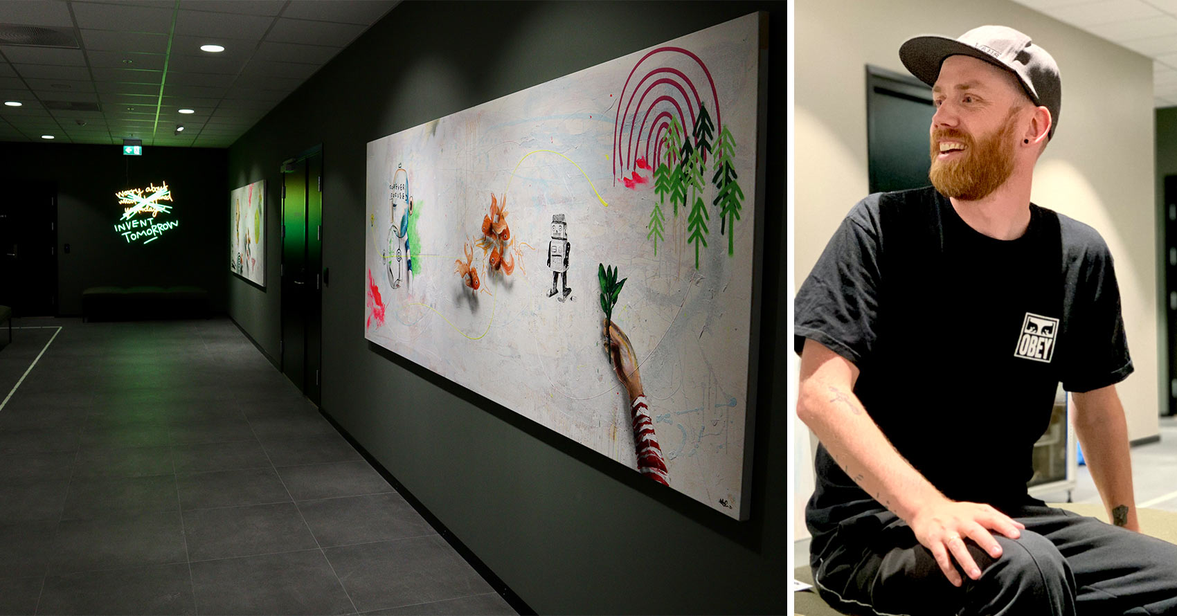 Det var Eva Bentsen fra Eva Bentsen Art Consulting som fikk oppdraget med utsmykningen av underetasjen på Noroff Kristiansand.